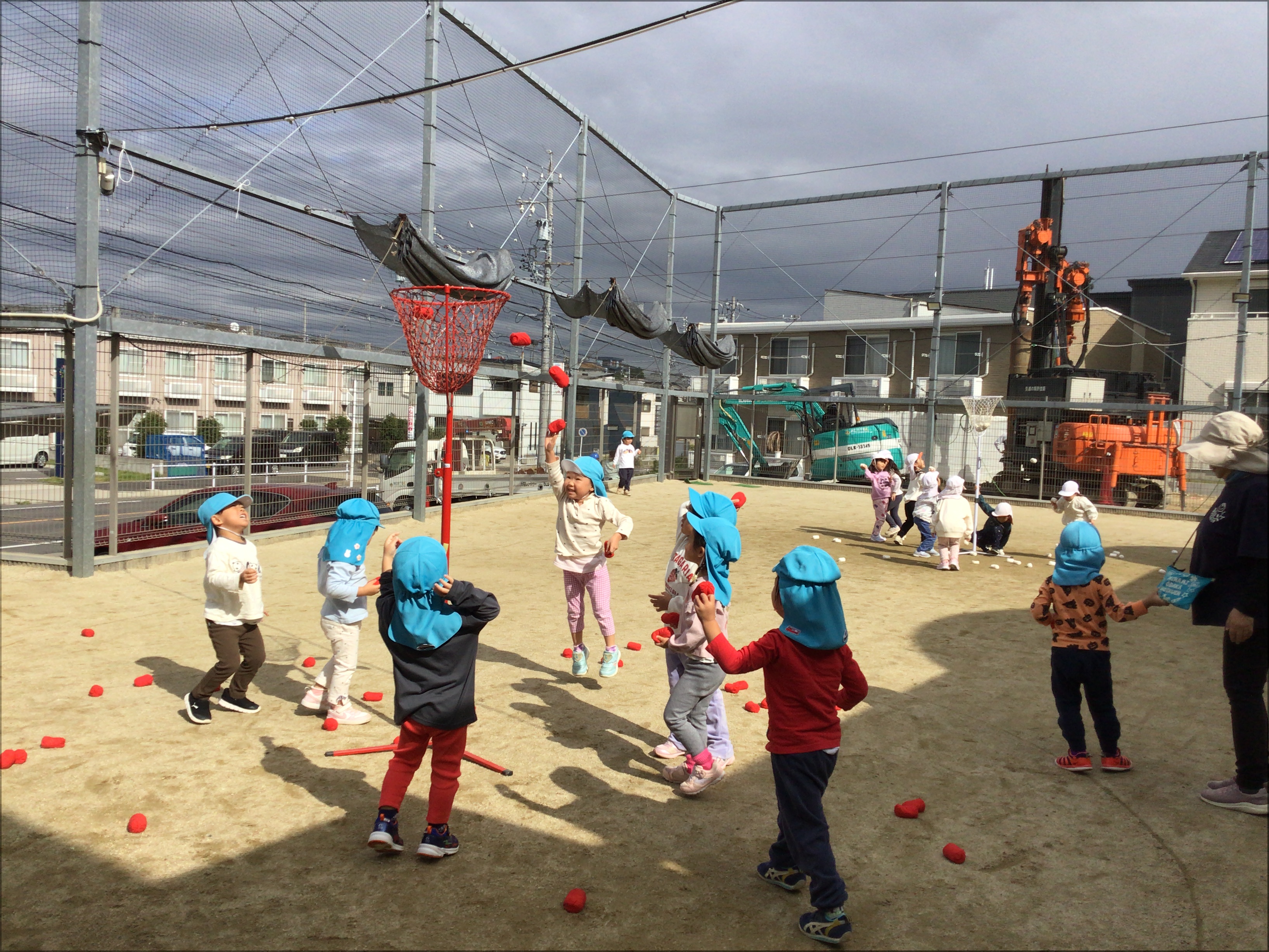 運動会の後にさくら組の玉入れを見て「やってみたい!」と話していた子どもたち。一回戦目はすみれ組対こすもす組、二回戦目はすみれ組こすもす組縦割りの虹グループ、星グループでの二回戦行いました。先に終わったチームは「がんばれー!」と応援していました。今から来年の運動会を楽しみにしている子どもたちです