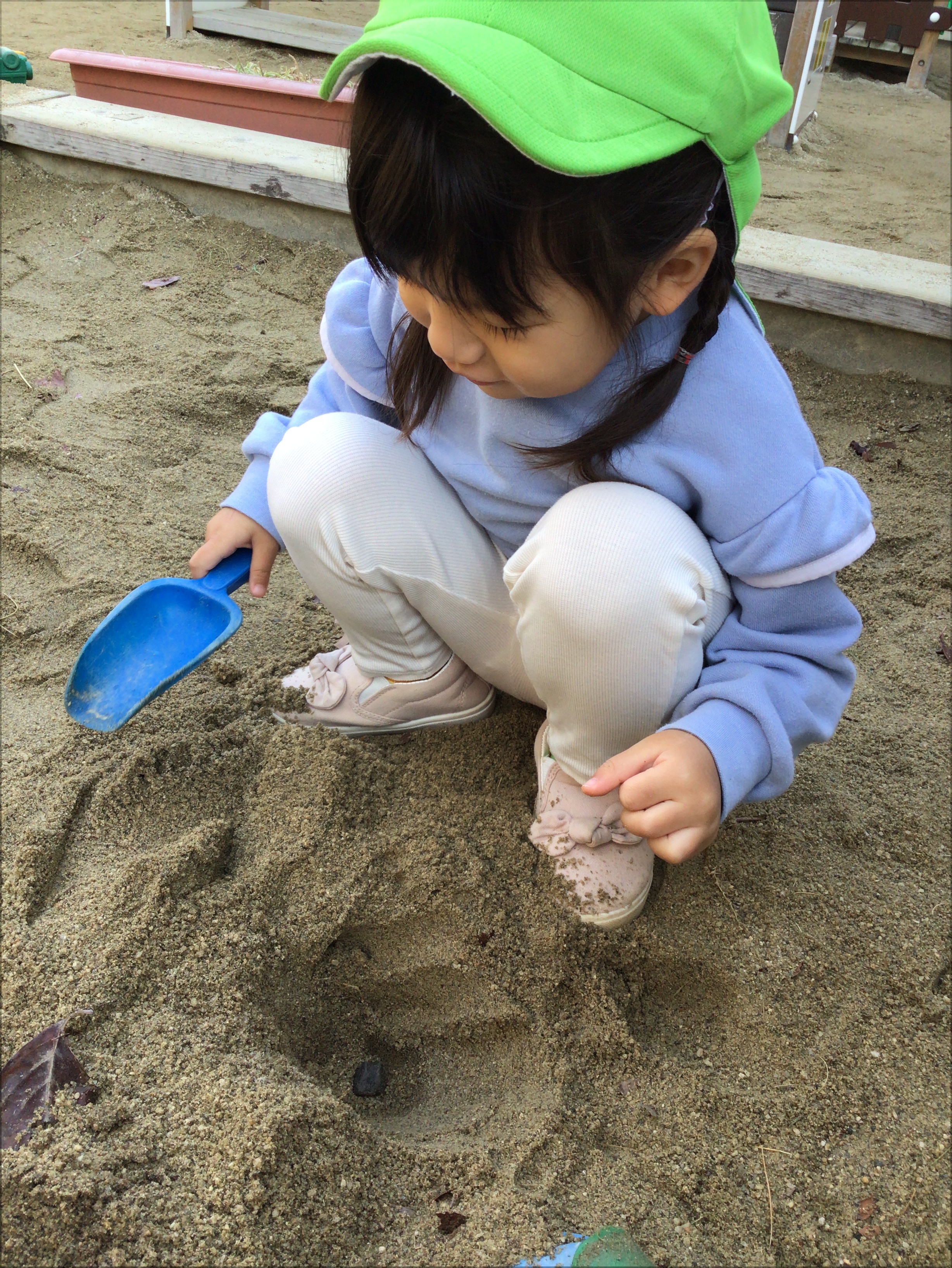 砂場では砂に石を埋めて"石探しゲーム"をしています。