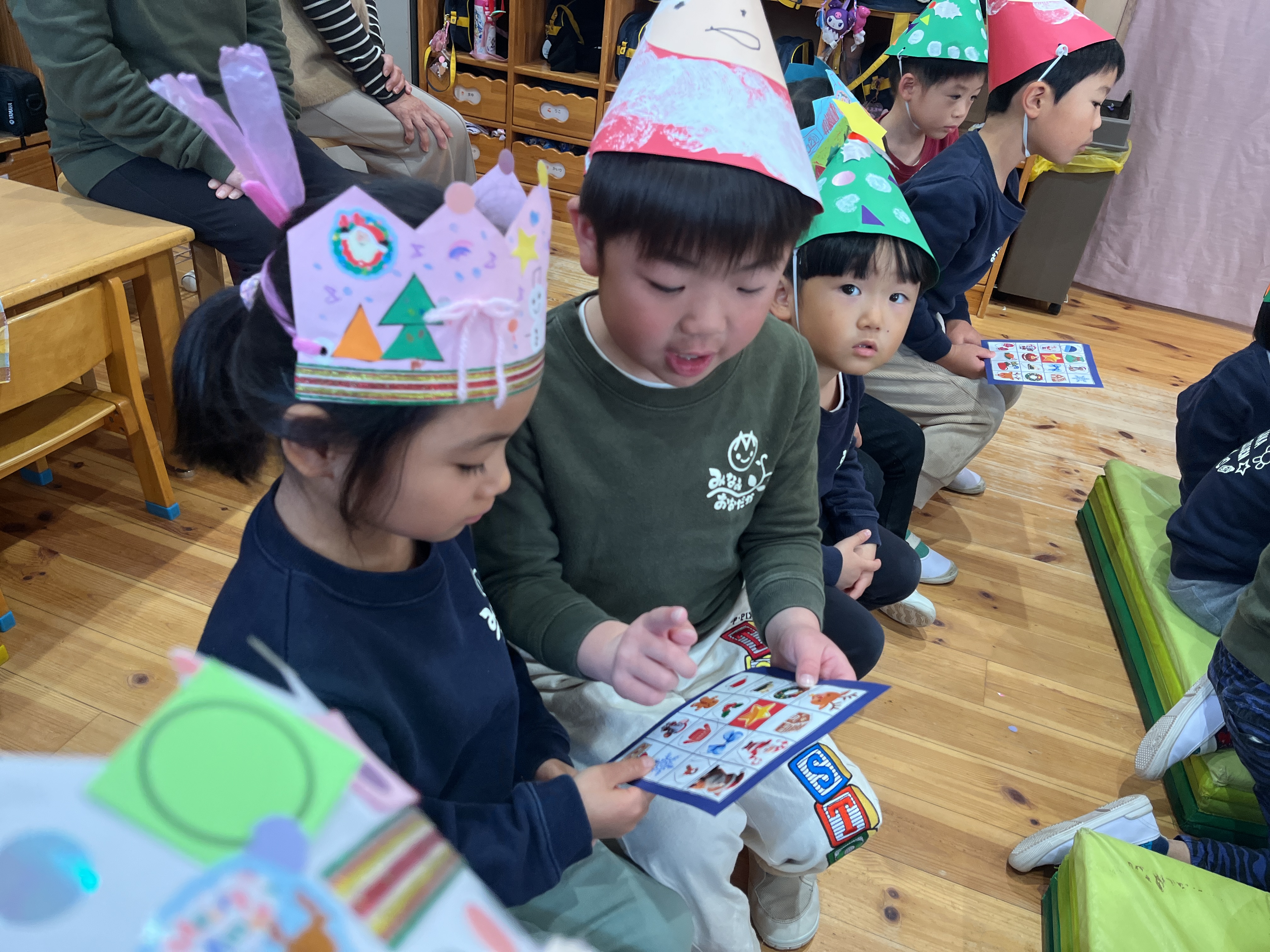 ビンゴ大会が始まりました!縦割りのペアで協力して進めていきます。さくら組がリーダーシップを取りながら、鉛筆で丸をつけたり同じイラストを探したりしていましたよ。