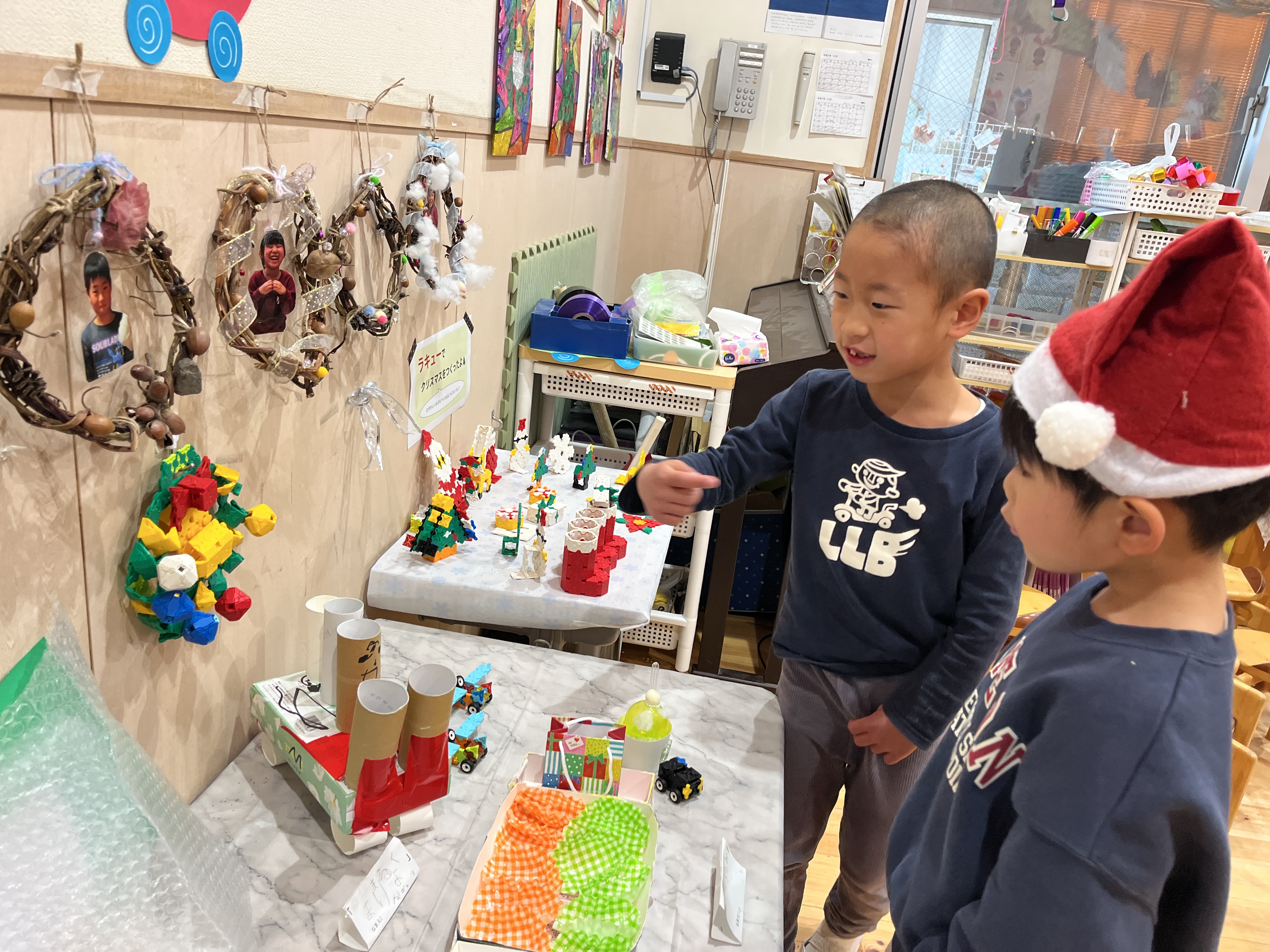 クリスマスプレゼントで欲しいものやLaQで作ったもの、クリスマスリースや共同製作のクリスマスツリーなどを展示。縁日ブースでは輪投げや雪合戦(ボール投げ)をして楽しみました♪