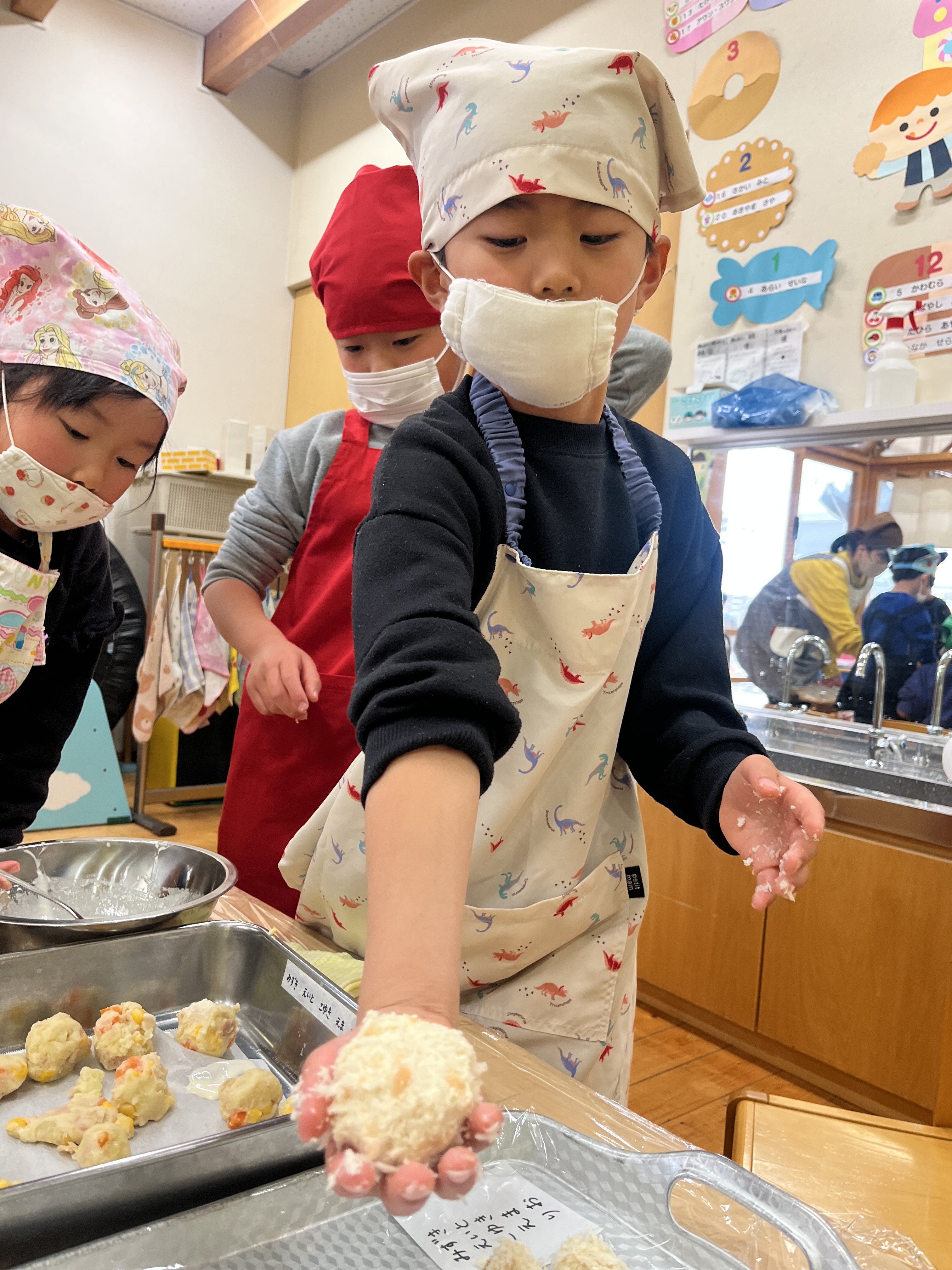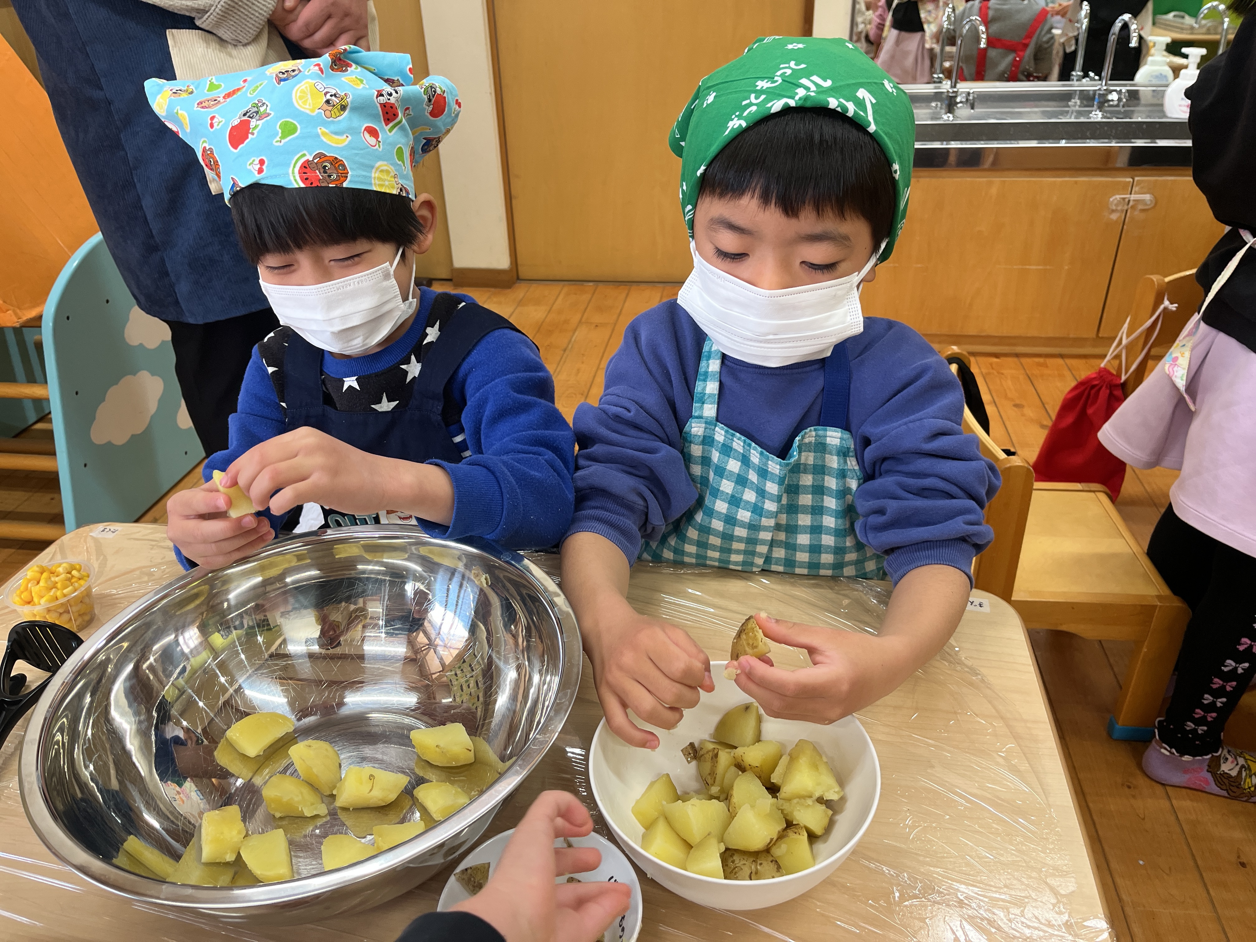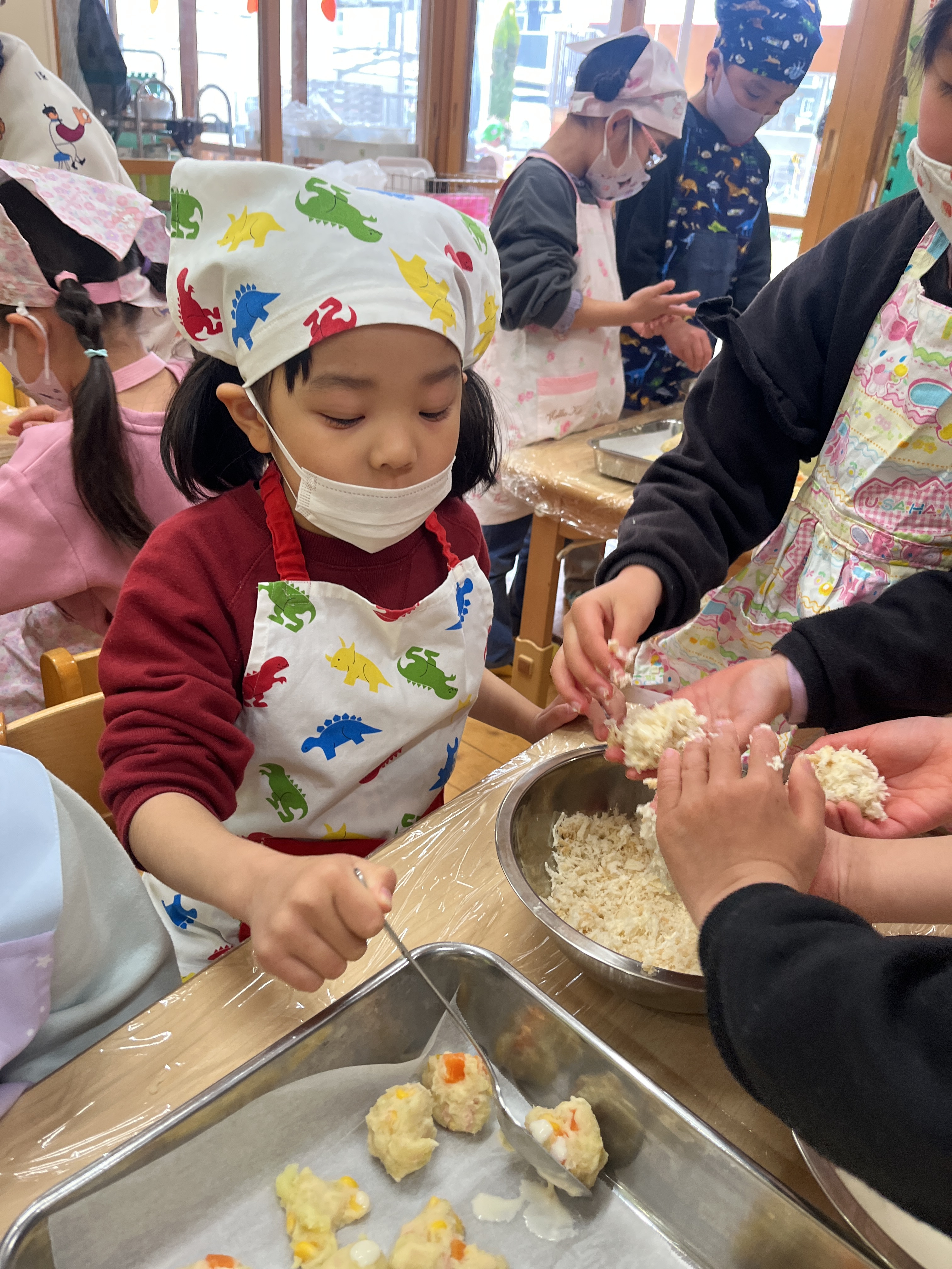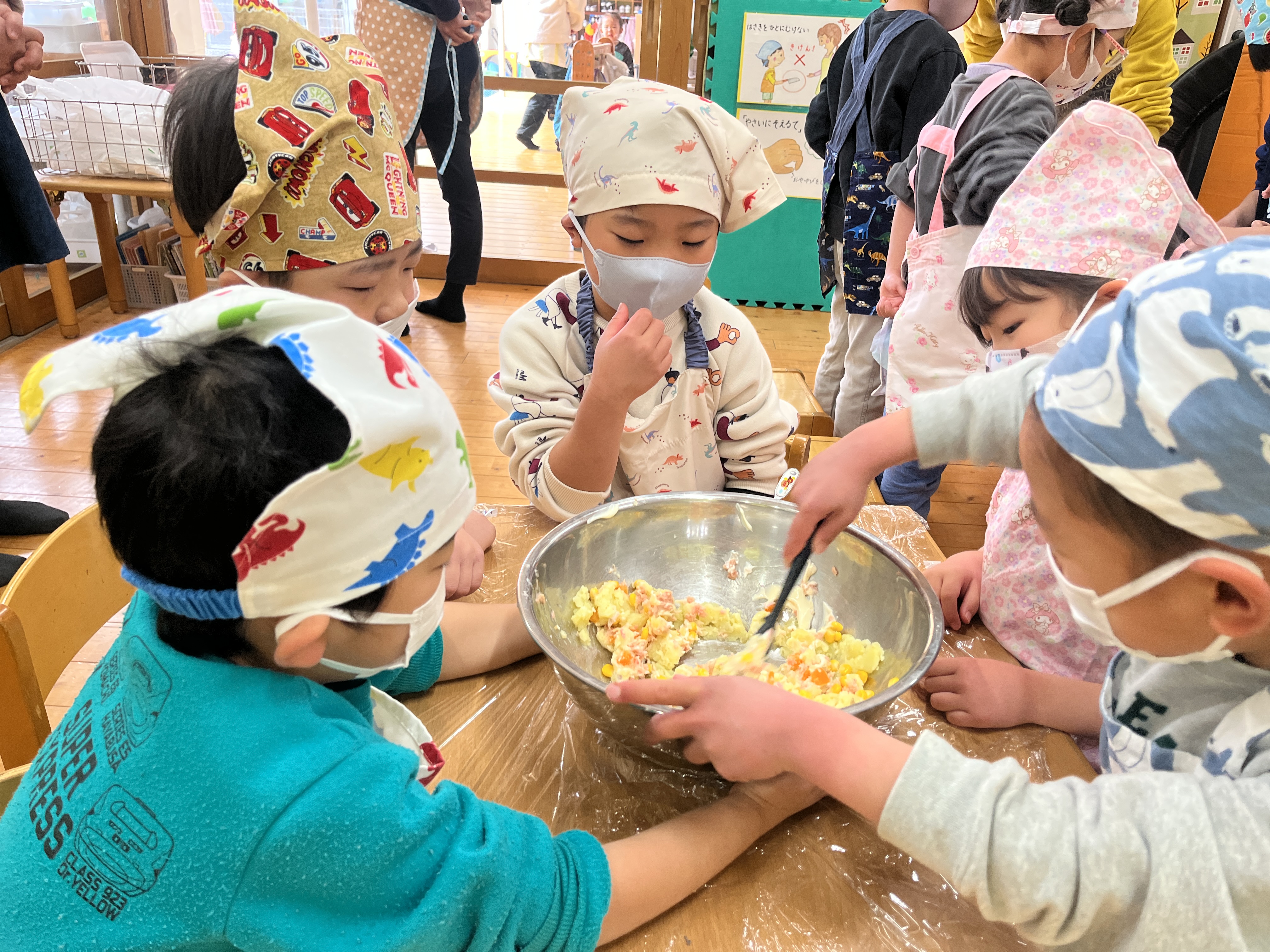 作り方を説明したあとは各テーブルで進めていきます。エプロンと三角巾とマスクを身につけ、手洗いが終わると準備は万端!「材料取ってくるね」「10回ずつつぶそう!」「次は何入れる?」と、声をかけ合う姿やお友だちが混ぜやすいようにとボウルをおさえてあげる姿が見られました。